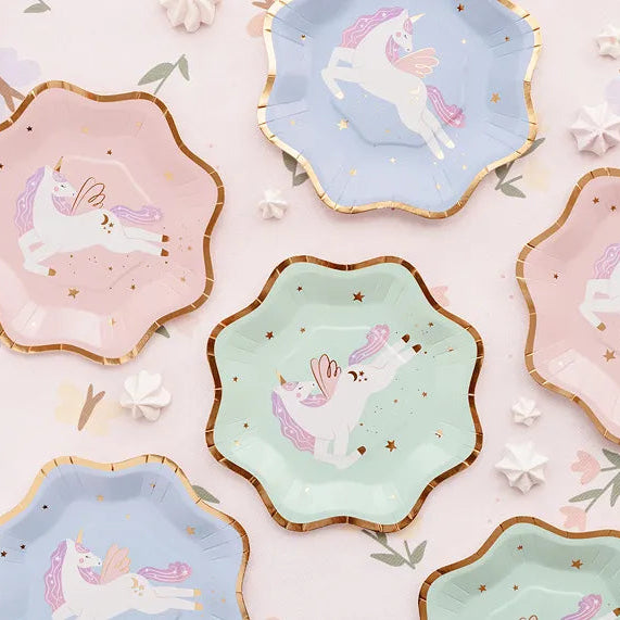 Skap en magisk borddekking med disse nydelige tallerkenene med enhjørningmotiv! Perfekte til enhjørningbursdag, prinsessefest eller enhver feiring som trenger et lite dryss av eventyr og fantasi.