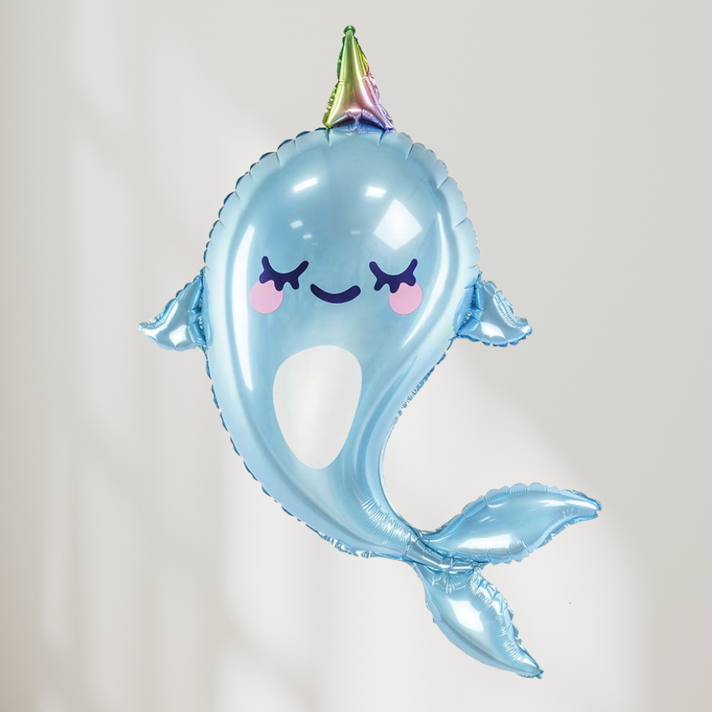 Denne sÞte narhvalballongen med sitt glitrende blÄ design, rosa kinn og regnbuefargede horn passer perfekt til bursdag, babyshower eller undervannstema! En magisk og leken dekorasjon som sprer glede og havstemning blant bÄde barn og voksne.