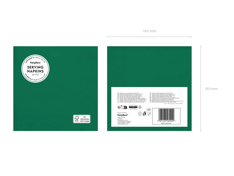 Serviettene måler 33 × 33 cm og er både praktiske og dekorative – fine til servering, bordpynt og små søl underveis. Den dype grønne fargen passer godt til naturtema, julefeiring, dinosaurfest eller andre grønne temafester hvor du ønsker et stilrent uttrykk.