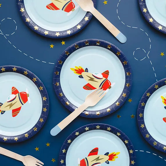 Gi borddekkingen et luftig og lekent preg med tallerkener dekorert med flymotiv! Disse små, fargerike tallerkenene er perfekte til barnebursdager, fly- eller skytema, transportfester eller enhver feiring hvor du vil skape en eventyrlig stemning.