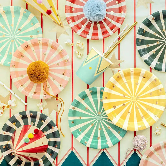 Skap en livlig og fargerik borddekking med disse tallerkenene i seks ulike farger! Med gult, rosa, lyst blått, rødt, blått, grønt får bordet umiddelbart et energisk og sirkusinspirert uttrykk — perfekt til barnebursdager, sommerfester, temafester eller enhver feiring som trenger ekstra farge og glede.