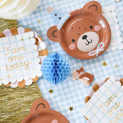 Det sjarmerende teddy-bjørndesignet gjør bordet ekstra innbydende og passer perfekt sammen med matchende servietter og kopper for en gjennomført og koselig feststil.